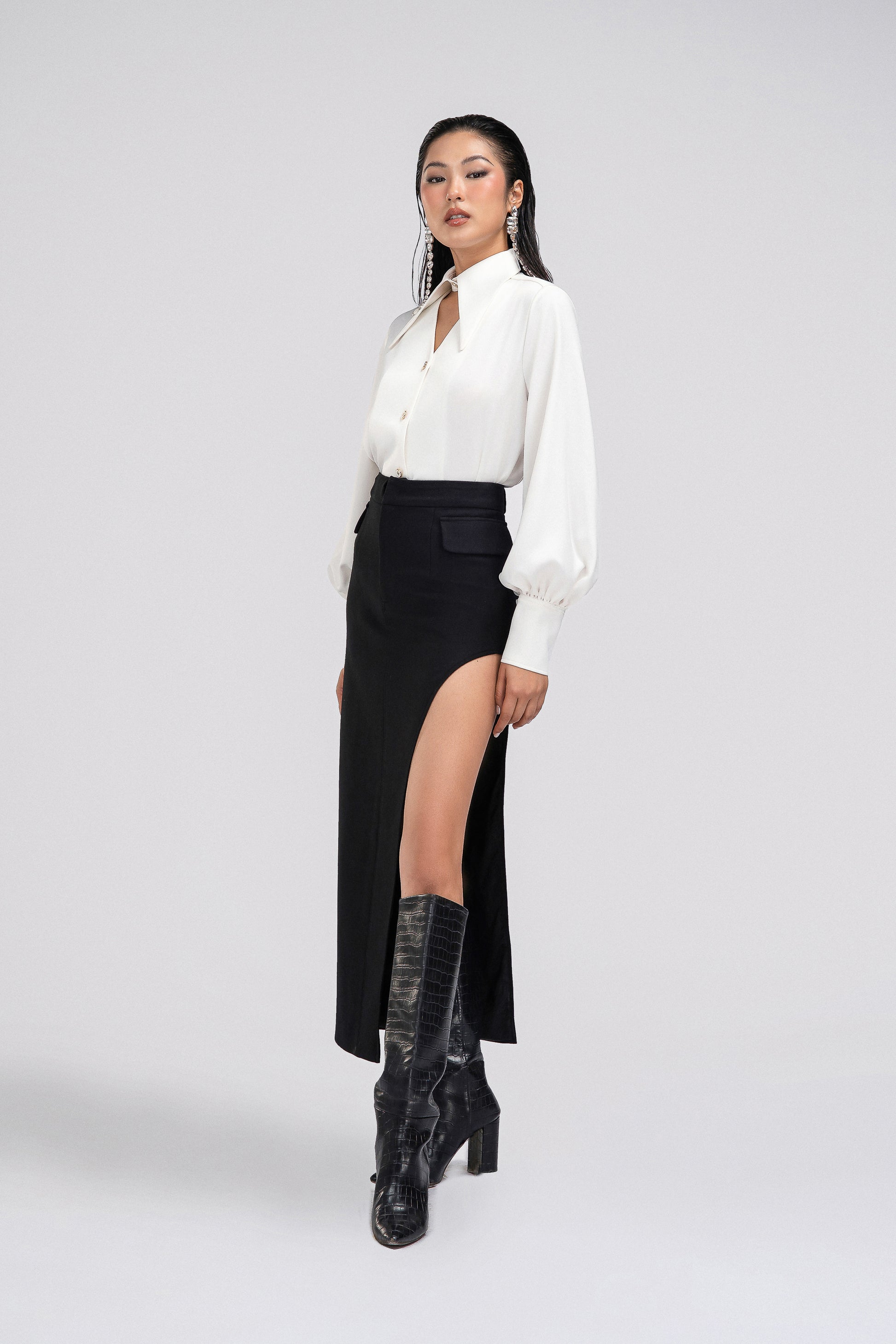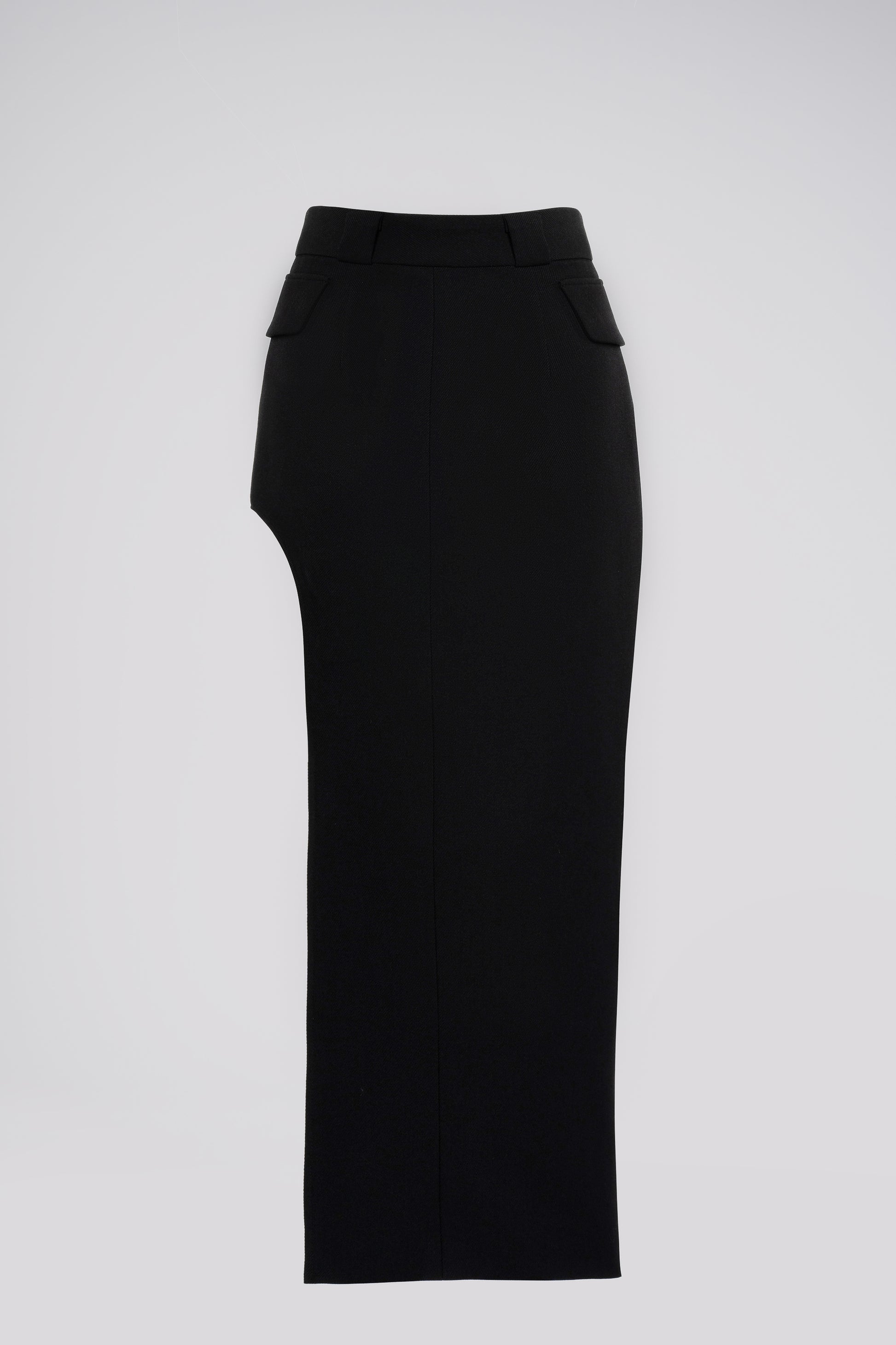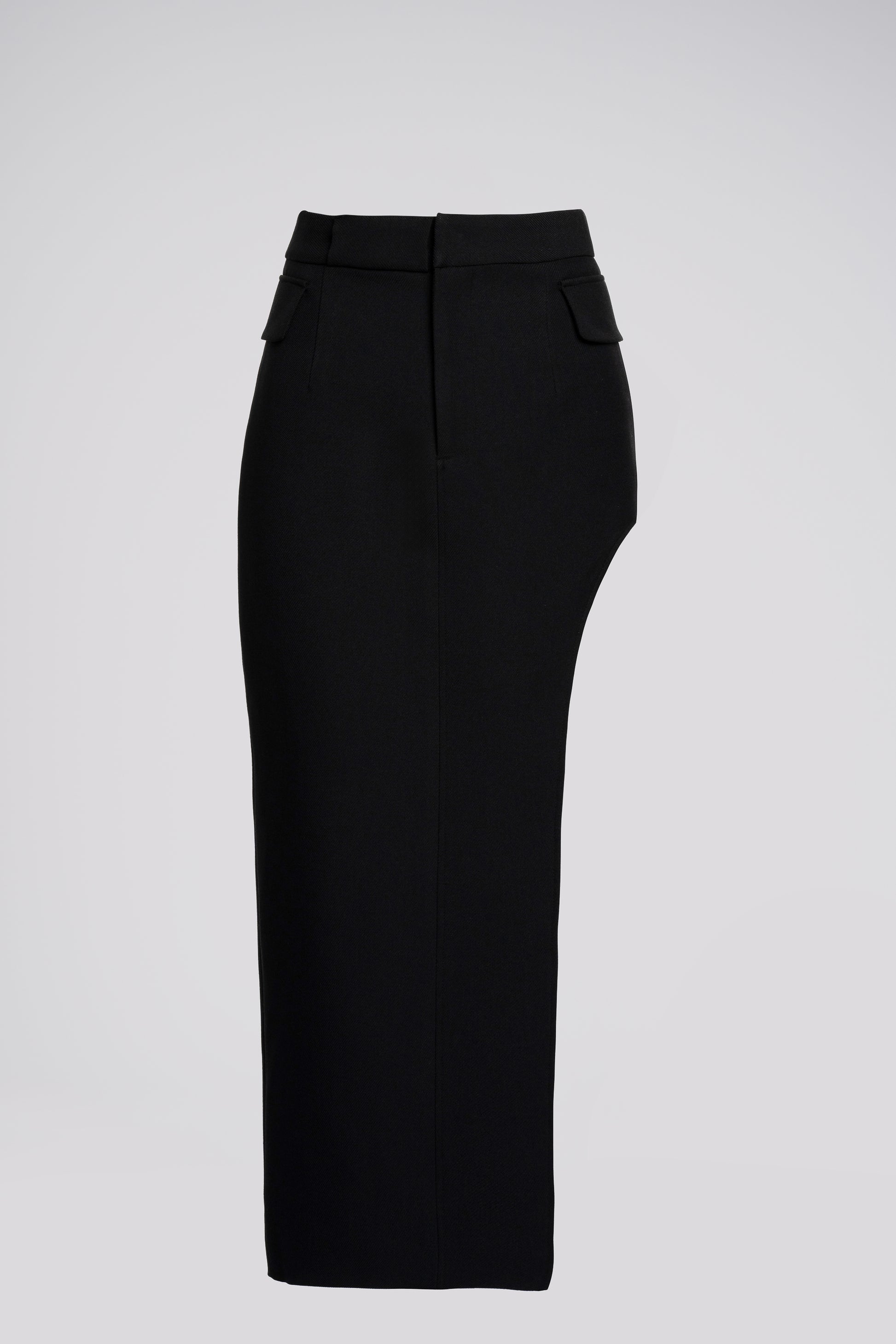 Make a bold statement with the Petite Cut Out Midi Skirt in Black. This skirt, designed for petite women, features a sophisticated high-waisted column shape with a daring cut-out detail that reveals one leg for highlighting your petite frame while maintaining a sleek silhouette. Asymmetric belt loops and side pocket flaps add a modern touch, while the fly front zip ensures ease of wear. Fully lined and crafted from stretch twill fabric, this skirt offers both style and comfort. The rich black fabric invites endless pairing possibilities, ensuring you're always the epitome of stylish refinement.